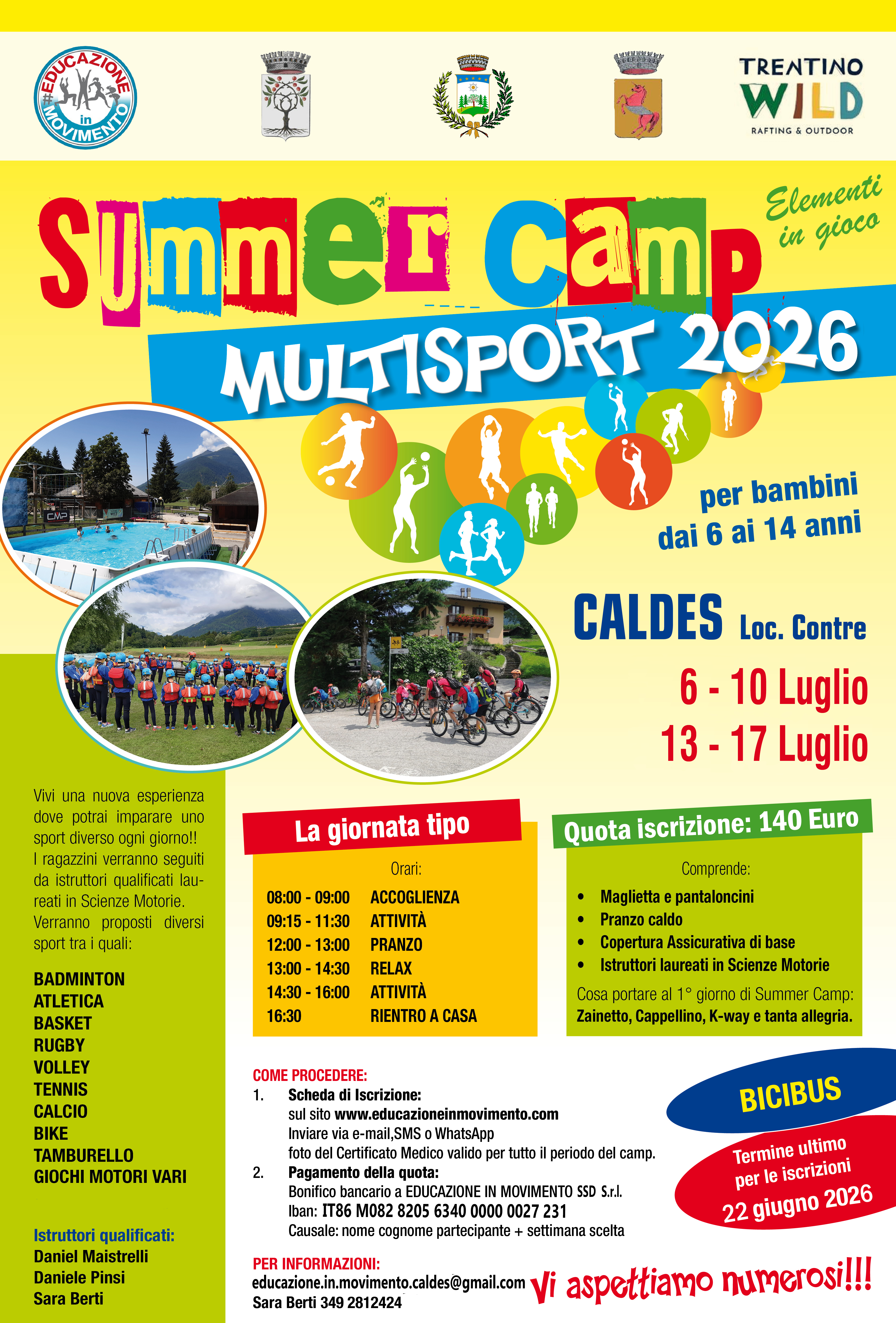 Per il pagamento fare bonifico a EDUCAZIONE IN MOVIMENTO SSD S.r.l. IBAN:IT86 M082 8205 6340 0000 0027 231; con Causale: settimana scelta + Nome partecipante.