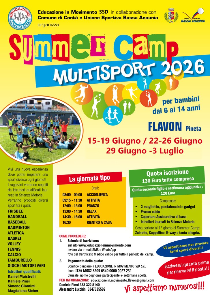 Vivi una nuova esperienza dove potrai imparare uno sport diverso ogni giorno!! I ragazzini verranno seguiti da istruttori qualificati laureati in Scienze Motorie. Verranno proposti diversi sport tra i quali: BASKET, ATLETICA, ORIENTEERING, VOLLEY, GIOCHI LUDICI, CALCIO, RUGBY, TAMBURELLO, GIOCHI MOTORI VARI.