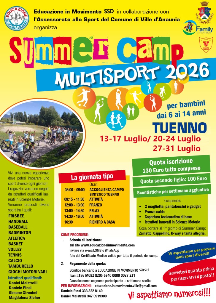 Dal 27 – 31 Luglio – Tuenno Campo Sportivo sintetico, Palestra! POSTI COMPLETI!!